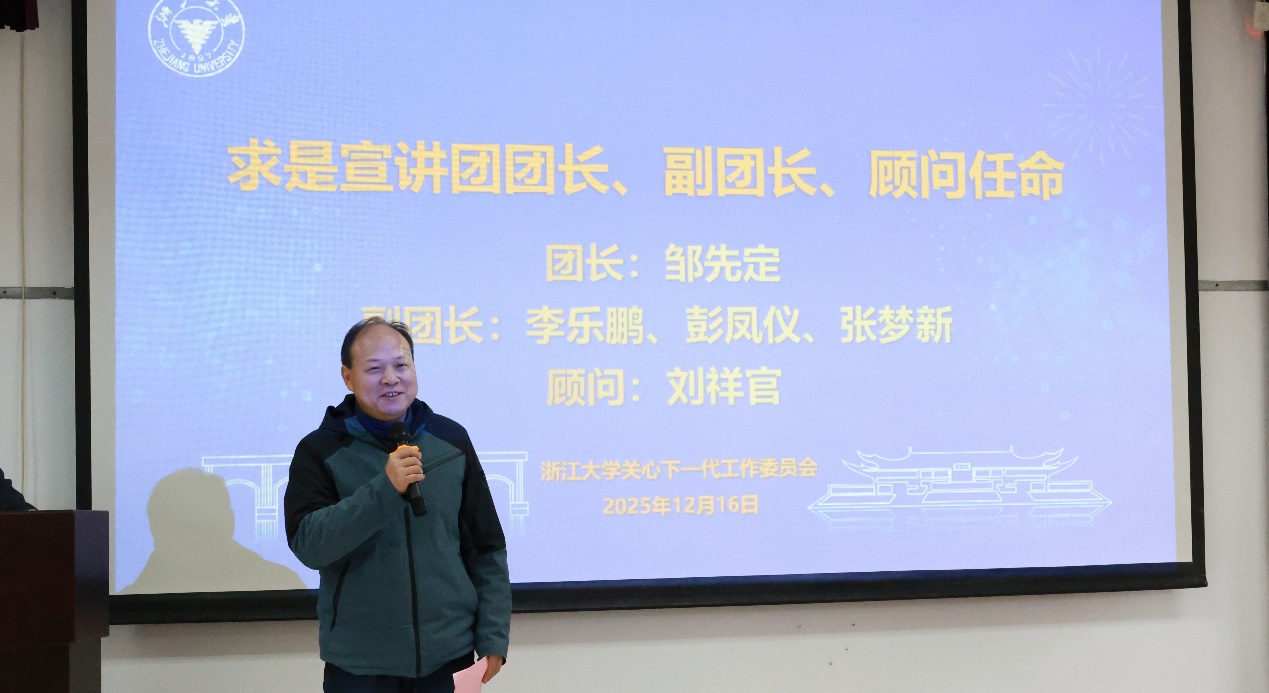 毕建权宣读《浙江大学关心下一代工作委员会关于调整校关工委求是宣讲团团长、副团长和顾问的通知》(浙大关工委〔2025〕3号文件) 。