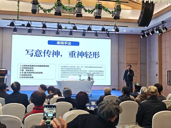 此次书画展活动还特别邀请了浙江老年大学周易之老师进行《花鸟画创作浅淡》的讲座。周老师从国画技法之规矩、线点面、构图、墨色等多个方面深入浅出地向大家讲解了学习创作花鸟画的要点,现场解答老同志们在创作花鸟画过程中遇到的困惑和难点,并利用大屏幕直播方式,在宣纸上用笔墨现场讲解花鸟画的构图要领,让与会老同志们受益匪浅。
