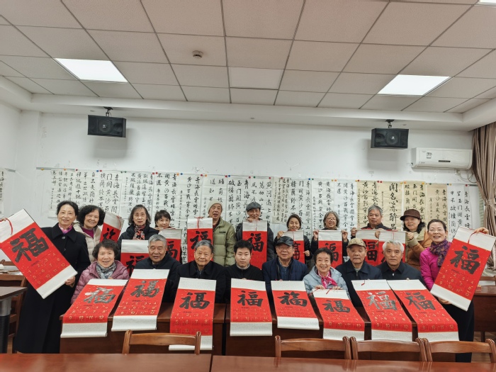 今天是本学期最后一堂书法课,赵老师还给大家带来了特别的惊喜,给每位学员赠送一副2026年挂历卷轴,上面的“福”字由赵老师亲自书写。这份礼物虽不昂贵,却饱含着赵老师对学员们的深情厚谊与美好祝愿。学员们接过卷轴,个个脸上洋溢着惊喜与感动,纷纷向赵老师表达感激之情,教室里充满了温馨与欢乐的氛围。