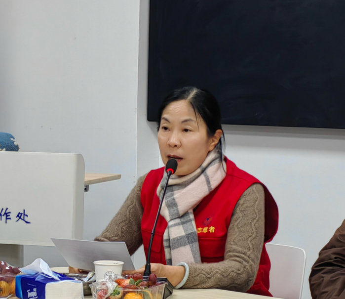 座谈会上,汪士清副队长做2025年度工作总结。过去一年,服务队持续深化“银暖夕阳”结对帮扶品牌,对结对的空巢、高龄老同志进行精准关爱,累计上门看望、陪伴59次,将温暖与慰藉送入家门。每月8日的“爱心驿站”活动已累计为超过250位老同志提供免费理发、维修等便民服务,成为深受老同志信赖与喜爱的暖心窗口。在“银尚乐服”方面,志愿者们积极协助离退休工作处开展中秋月饼发放、重阳健步走、老年运动会、校园参观引导等多项大型活动,以热情周到的服务守护秩序、传递关怀,成为校园内一道动人的“志愿红”风景线。此外,服务队制度建设日趋完善,制定结对帮扶、驿站值班等工作要求,并组织参与多项技能培训与参观学习,不断提升服务的规范化与专业化水平。