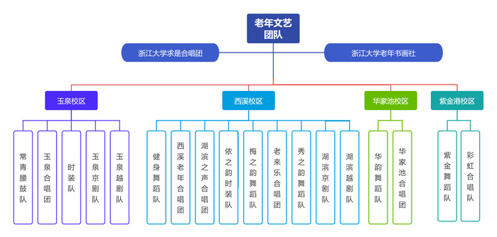 浙江大学老年文艺团队是由校内一批热衷于艺术事业的乐龄群体自发汇聚而成的群众性文艺组织。经过长期不懈的努力和深入的实践探索,已组建合唱、舞蹈、腰鼓、时装表演、京剧、越剧等多个文艺团队。其中,由离退休工作处主管的求是合唱团曾多次在省市、学校的合唱比赛中获奖。每两年举行一次全校老年文艺演出,表彰先进集体和个人。